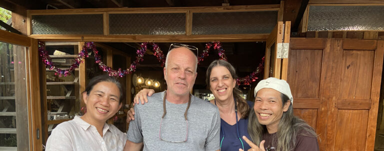 בעוד אנחנו מתרשמים ממוצרי הגלריה פגשה אותנו אישה מקסימה, בעלת הבית והזמינה אותנו לסייר בסדנה ובבית הנושק לגדת הנהר. שתייה וכיבוד צצו גם ושיחה נעימה קלחה. הכנסת אורחים מיוחדת אשר חיממה את ליבנו וגרמה לנו לאהוב אף יותר את בני העם התאי הנחמדים כל כך ואת העיר לאמפאנג. הכרנו את בני המשפחה ועובדי הסדנה ונפרדנו מהם בהבטחה לשמירה על קשר.