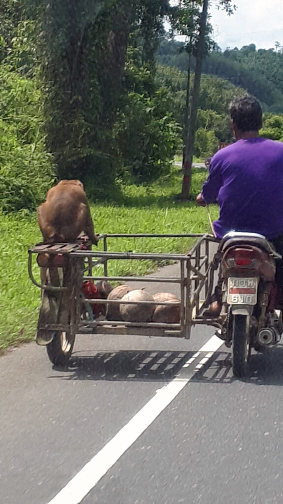 ומראה איש רכוב על אופנוע וליצדו קוף, גם הוא אינו מראה מפתיע בתאילנד. קופים מאולפים מאומנים לקטוף אגוזי קוקוס.
