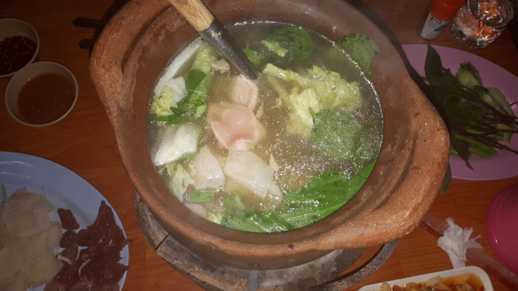 מול הכניסה למוטל, מסעדת Hot Pot מקומית על שרפרפים. מרק טעים בכלי חרס ובו מבשלים הסועדים בעצמם, תוספות בשר ומאכלי ים.
