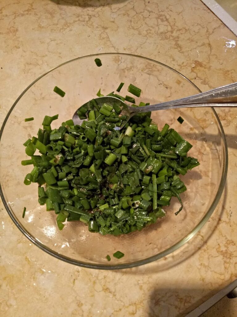 בקערה: ערבבתי בצל ירוק חתוך (במתכון האמיתי – בצל ירוק תאילנדי שהוא מעין הכלאה בין בצל ירוק-עירית ושום. הוספתי את התבלינים הנדרשים: סוכר – כמובן. כי כמעט ואין מאכל תאי ללא. (במקרה שלי, הוספתי סוכר קוקוס).