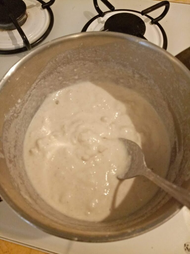 אחרי המתנה קצרה לעיסה שמתמצקת לה בעדינות בכוח האדים, מתקבלת עיסה מוצקה יחסית, אותה ניתן לחתוך לנתחים ולטגן בזהירות על אש קטנה במחבת גדולה.
