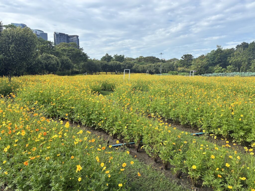 וכאן מצולמים מרבדי פרחי קוסמוס צהובים באוגוסט.