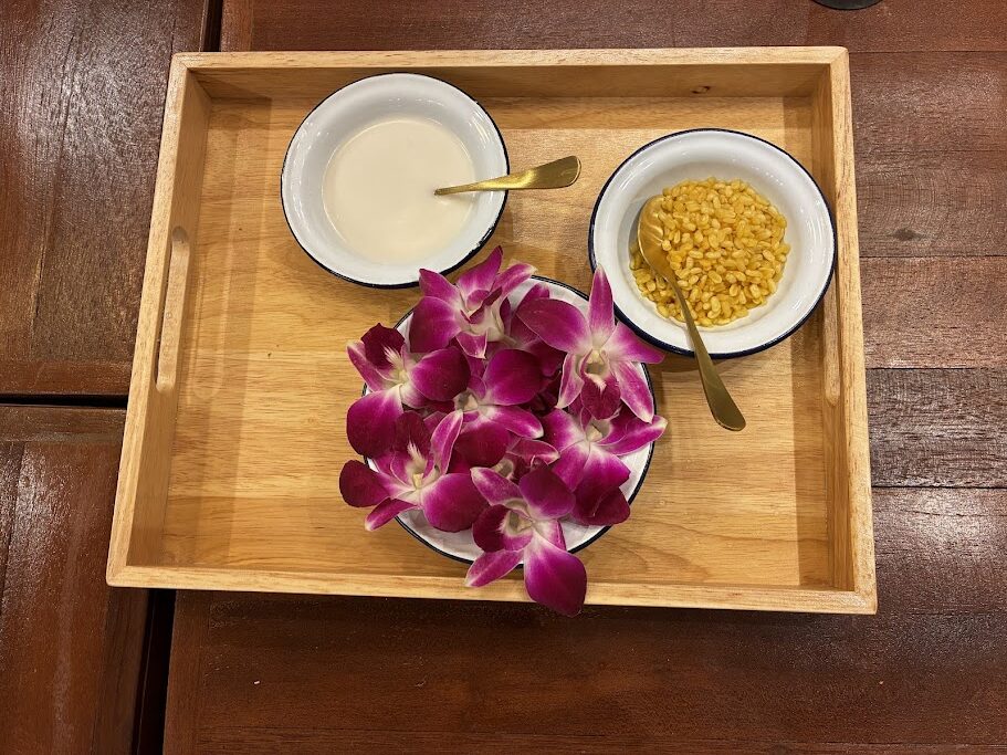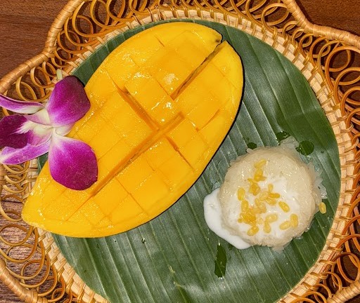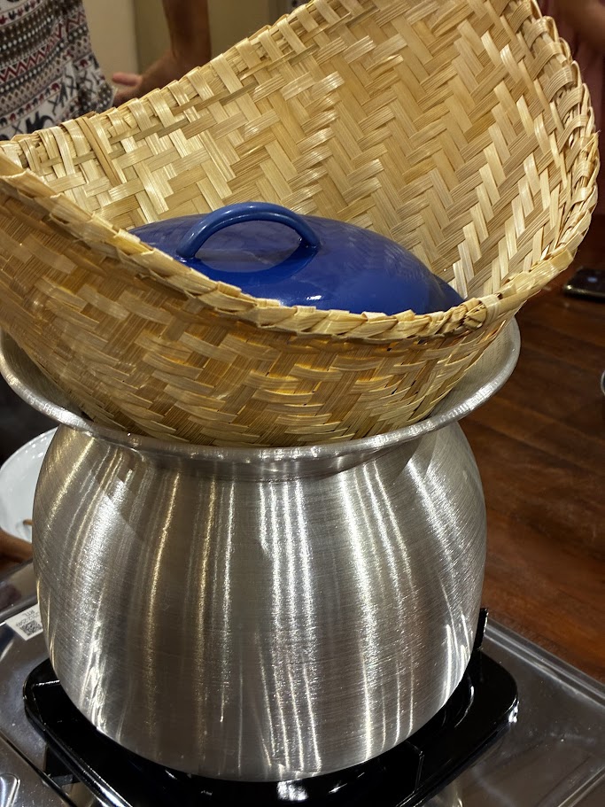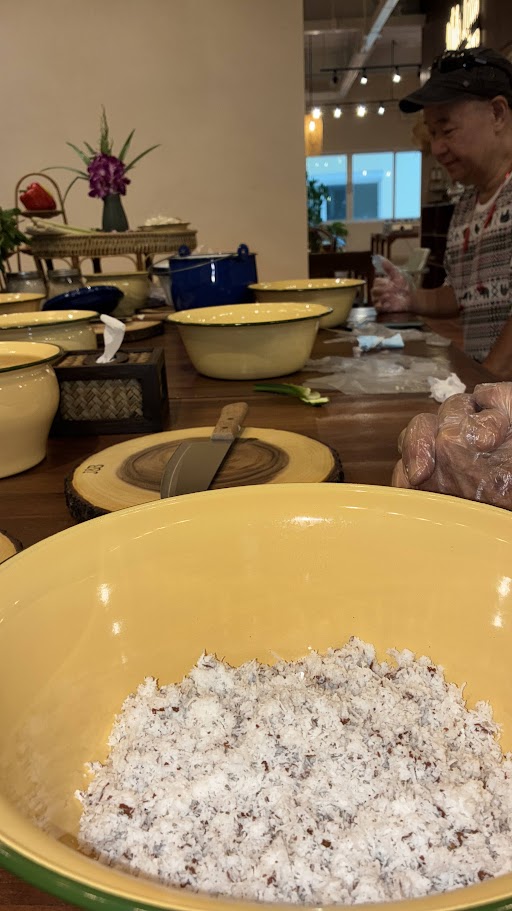 האורז הדביק שאודה והוקפץ בסלסלה ושוב אודה, זכה לטבילה הגונה של קרם הקוקוס שתובל מראש. הוכנס לתבנית וקיבל צורה נאה ותוספת של רוטב קוקוס וגרגרי שעועית צהובה קלויים, שהסיפו מרקם קראנצ'י למנה.