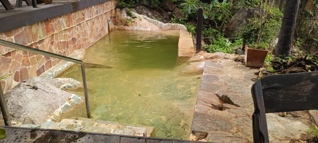 בתמונה: בריכת מים מינרלים קרירה ומרעננת, הצופה לנוף הנהר הבוצי שמתחת.