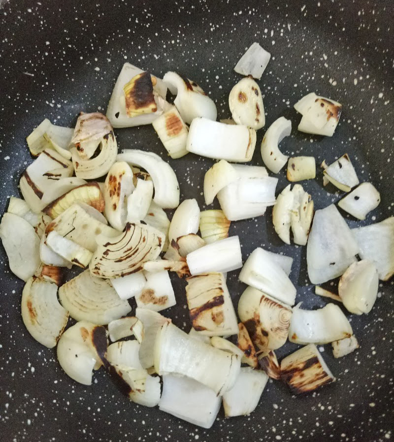 בתאילנד, ברור כי משתמשים בבצלצלי שאלוט. אצלנו בערבה, עדין לא התפתחנו מספיק ויש לנו בצל יבש רגיל. בשלב הזה אני חורכת חתיכות בצל ושום באותה המחבת.