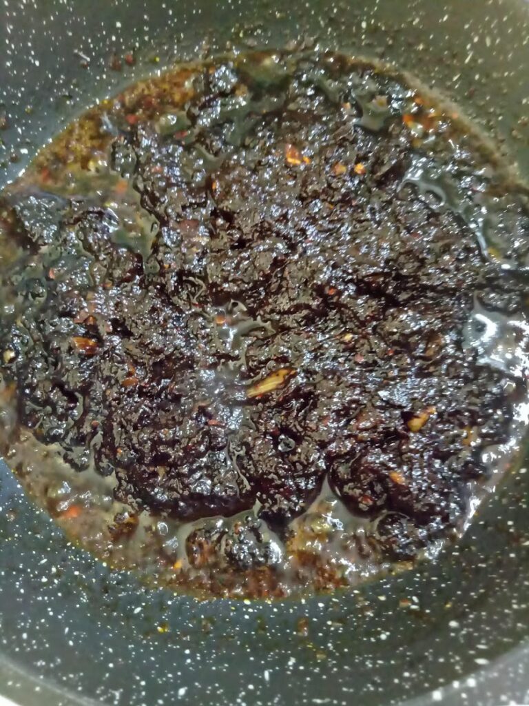 כעת נותר למעוך במעבד מזון הכל יחד: אבקת הצ'ילי שהכנתי, שום ובצל חרוכים. מעט רוטב סויה.  תרכיז תמרינדי, סוכר דקלים ומעט שמן קוקוס. אחרי שהכל הופך לעיסה ריחנית מעבירה למחבת ובה מעט שמן קוקוס לטיגון עוצמה.