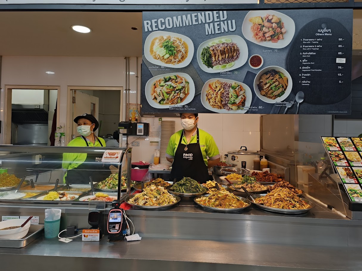 6. טרמינל 21 בקומה העליונה, במרכז האוכל: דוכן צמחוני – Mungsavirat – มังสวิรัติ – מנות זולות, חריפות וטעימות.