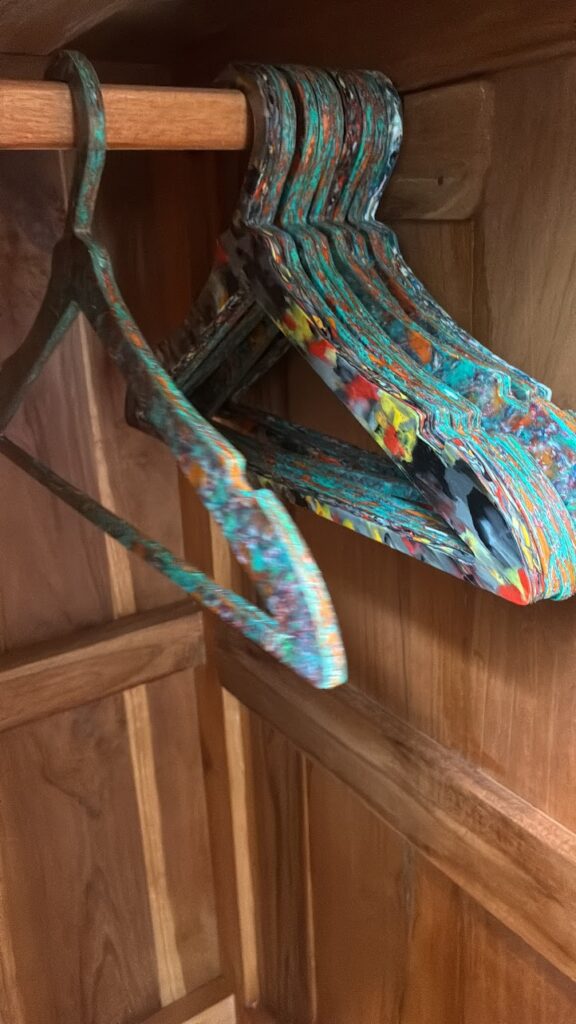 ובתמונות: תשומת לב לפרטים הקטנים, כפי שאני אוהבת: שרשרת פרחי הידרנג'אה אשר קבלנו בצ'ק אין. וגם קולבים יפיפים מפלסטיק ממוחזר.
