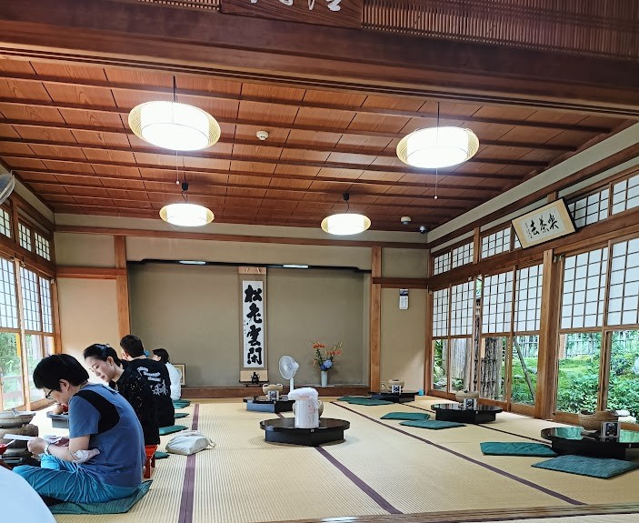 תחילה חשבנו כי המסעדה סגורה, היות וגוגל מפס כיוון אותנו לכניסה האחורית. אבל לא התייאשנו למרות החום הנורא ששרר (36-7 מעלות ביפן!!!) ומצאנו את הכניסה הראשית בכיוון אחר. (שער ועליו וילון כחול). יש לחלוץ נעליים. כך שאני מראש מאוהבת… הסבה על רצפת טאטאמי מול נוף מעורר השתאות.