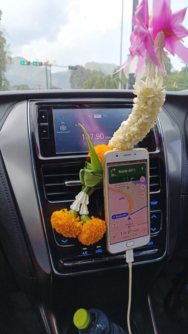 מצוידים בזר ריחני, מלאכת-יד,שקנינו ב-20 באט מרוכלת בכביש, יצאנו מהמלון המפנק שלנו בקראבי
